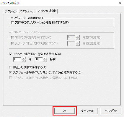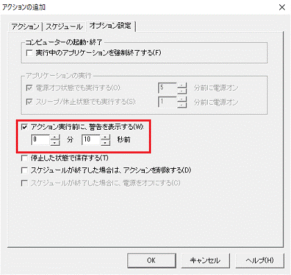 - 「アクション実行前に、警告を表示する」にチェックを付けると、アクションを実行するまでの残り時間が画面に表示されます。