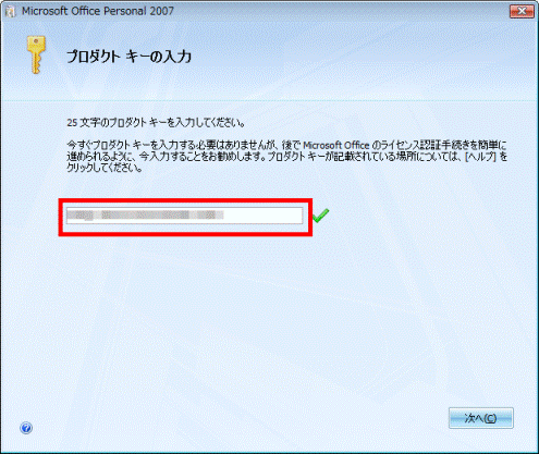 プロダクトキーは、「Microsoft Office Personal 2007」と書かれたディスクが入っていた袋に記載されています。 - 「次へ」ボタンをクリックします。