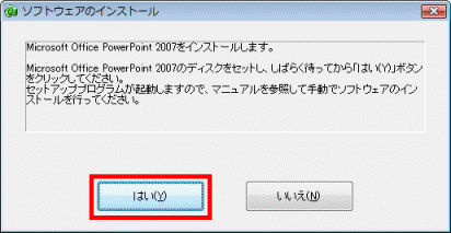 「Microsoft Office PowerPoint 2007」と書かれたディスクを取り出します。 - 「はい」ボタンをクリックします。