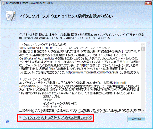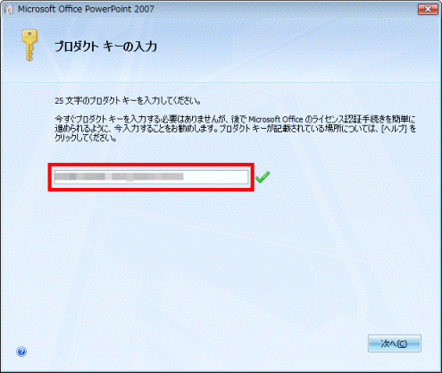 プロダクトキーは、「Microsoft Office PowerPoint 2007」と書かれたディスクが入っていた袋に記載されています。 - 「次へ」ボタンをクリックします。