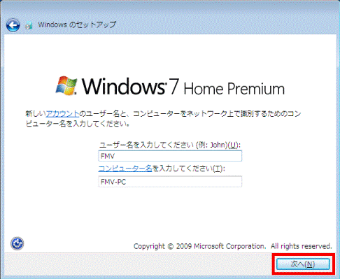 - 「新しいアカウントのユーザー名と、コンピューターをネットワーク上で識別するためのコンピューター名を入力してください。」と表示されます。