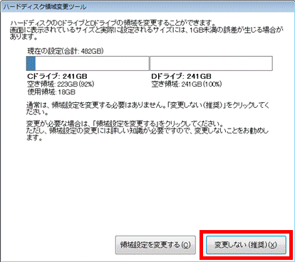 ハードディスクの領域設定を確認し、「変更しない」ボタンをクリックします。
