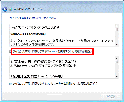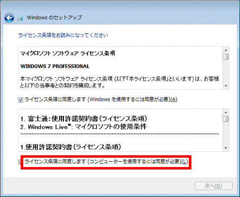 「マイクロソフトソフトウェアラインセンス条項」をよく読み、同意する場合は「ライセンス条項に同意します」をクリックし、チェックを付けます。