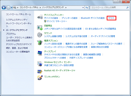 - 「デバイスとプリンター」の「マウス」をクリックします。