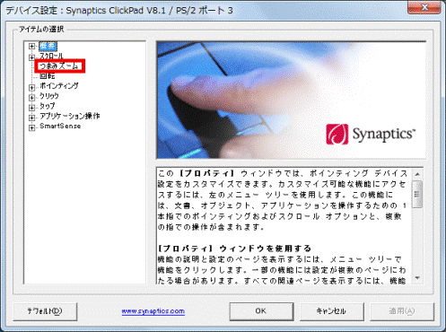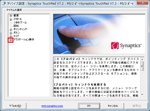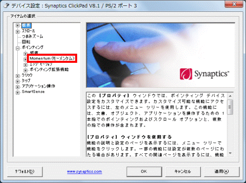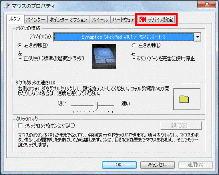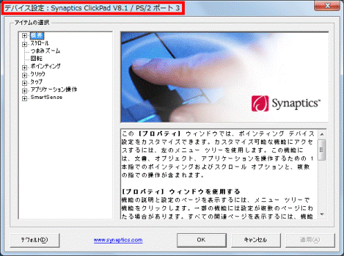 - 「デバイス設定:Synaptics TouchPad V(バージョン名)」または、「デバイス設定:Synaptics ClickPad V(バージョン名)」が表示されることを確認します。