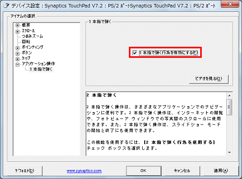 - 「2本指で弾く行為を有効にする」をクリックし、チェックを付けます。