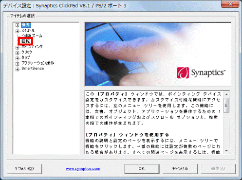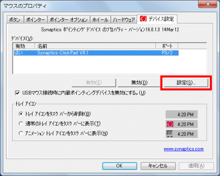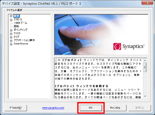 - 「OK」ボタンをクリックし、「デバイス設定:Synaptics TouchPad V(バージョン名)」または、「デバイス設定:Synaptics ClickPad V(バージョン名)」を閉じます。