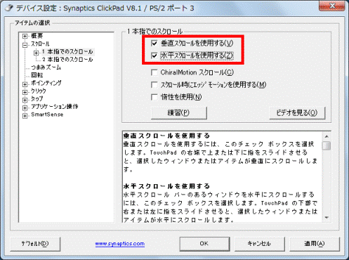 設定を無効にする場合は、「垂直スクロールを使用する」と「水平スクロールを使用する」の両方のチェックをクリックして外します。