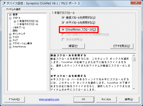 設定を終了するときは、「設定を終了する」へ進みます。 - 「ChiralMotion スクロール」の文字の表示が、灰色から黒色に変わります。