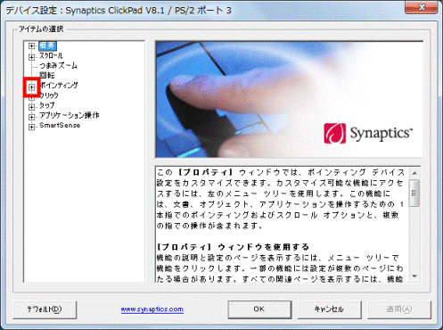 はじめに、お使いの機種にSynaptics ポインティングデバイスが付属しているかどうかを確認します。