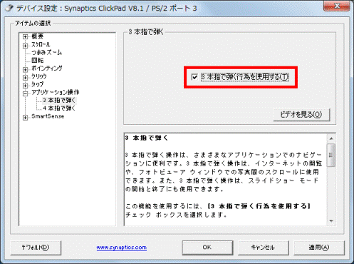 - 「3本指で弾く行為を使用する」をクリックし、チェックを付けます。