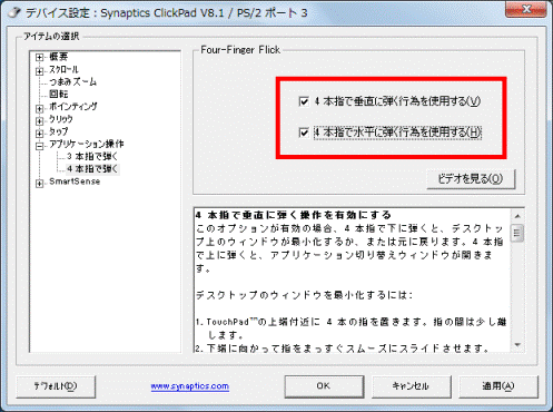 - 「4本指で垂直に弾く行為を使用する」と「4本指で水平に弾く行為を使用する」をクリックし、チェックを付けます。