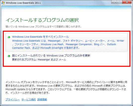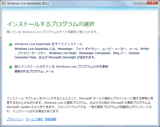 項目内に表示されているプログラムがすべてインストールされます。 - 「既にインストールされているWindows Live プログラムのみを更新」