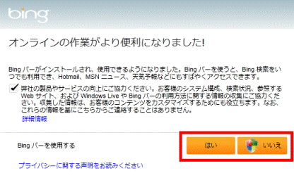 Bing バーを使用するかどうかによって、「はい」ボタンまたは「いいえ」ボタンをクリックします。