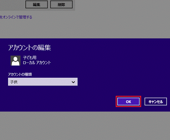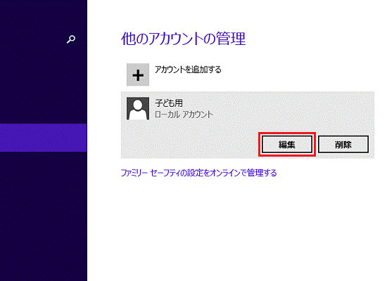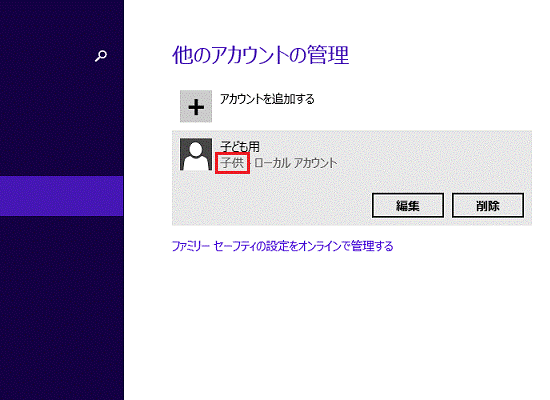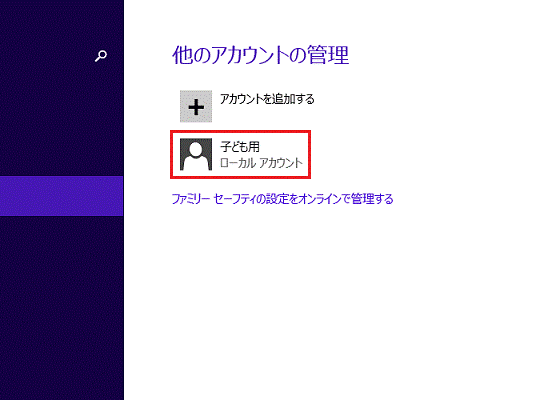 Windows 8.1をお使いの場合は、次の手順で、アカウントの種類を「子供」に変更します。