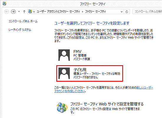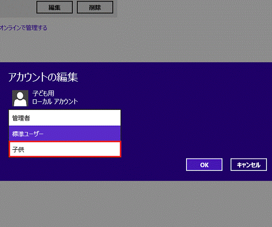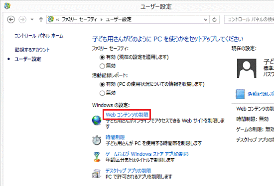 - 子どもが使用:アカウントの種類が「子供」(Windows 8.1)、または「標準」(Windows 8)のユーザーアカウント