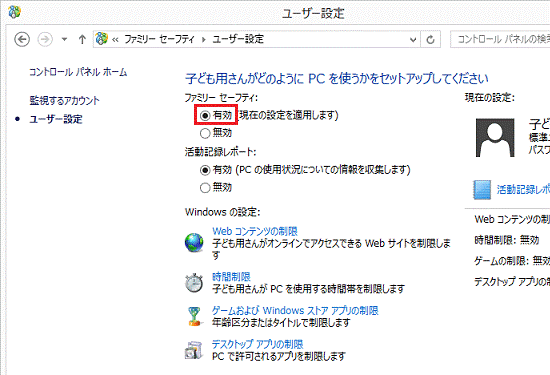 - 「ファミリーセーフティ」の「有効」をクリックします。