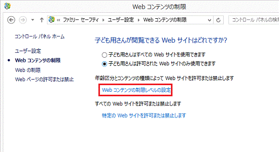 「XXX」には、手順6.でクリックしたユーザーアカウントの名前が表示されます。 - 「Web コンテンツの制限レベルの設定」、または「Web フィルターレベルの設定」をクリックします。