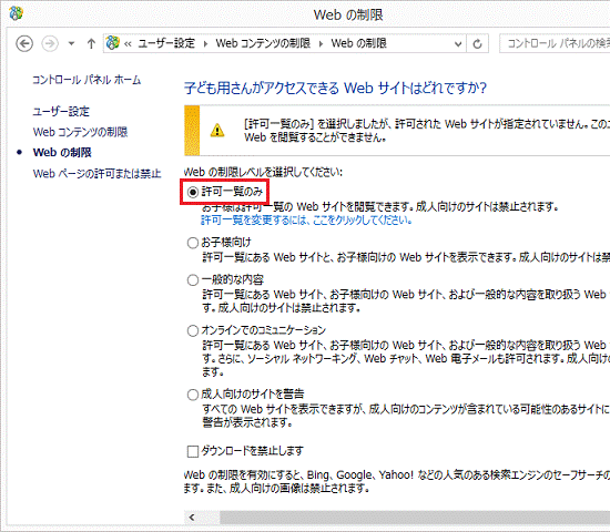 登録したホームページを除く、すべてのホームページのアクセスを制限(ブロック)します。 - 禁止