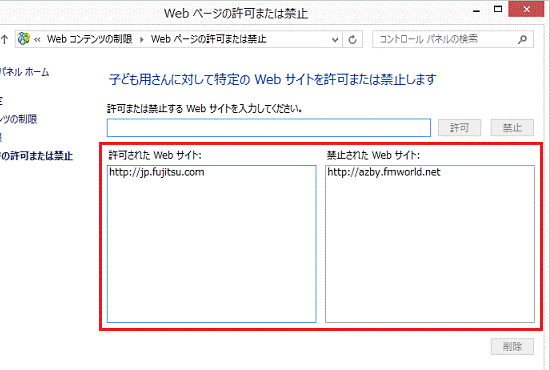 - 「許可されたWeb サイト」、または「禁止されたWebサイト」に、手順13.で入力したURLが表示されていることを確認します。