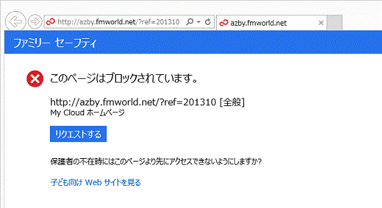 ファミリーセーフティで禁止されているホームページを開くと、「このページはブロックされています。」と表示されます。