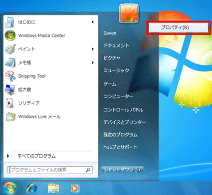 - スタートメニューの何もない部分を右クリックし、表示されるメニューから「プロパティ」をクリックします。
