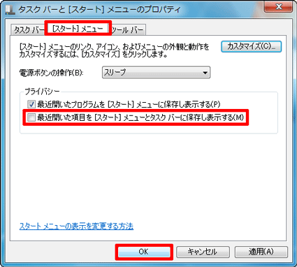 「[スタート]メニュー」タブをクリックし、「最近開いた項目を[スタート]メニューとタスクバーに保存し表示する」をクリックしチェックを外したら、「OK」ボタンをクリックします。![近開いた項目を[スタート]メニューとタスクバーに保存し表示する」をクリックしチェックを外す](../private/200909/2500000007/003.gif)