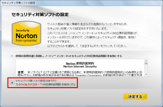 「セキュリティ対策ソフトの設定は後で行う 又はウイルスバスター(90日間無料体験版)を有効にする」、または「セキュリティ対策ソフトの設定は後で行う 又はウイルスバスター(90日間無料体験版)を利用する」をクリックします。