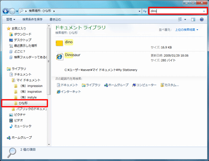 - 目的のフォルダーを開き、検索ボックスにキーワードを入力すると、ウィンドウ内に検索結果が表示されます。