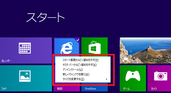 Windows 8.1 Updateを適用すると、スタート画面で右クリックした場合、アプリバーではなく、デスクトップと同じようなメニューが表示されます。