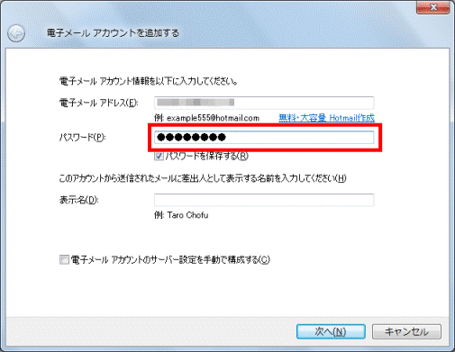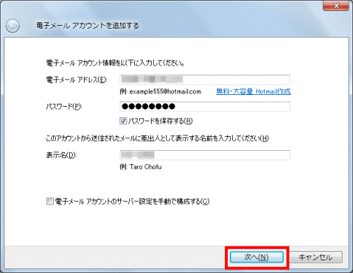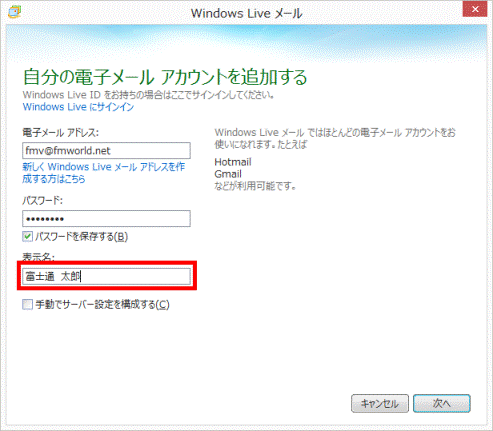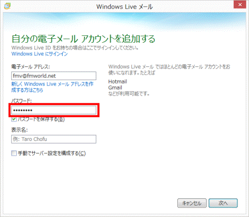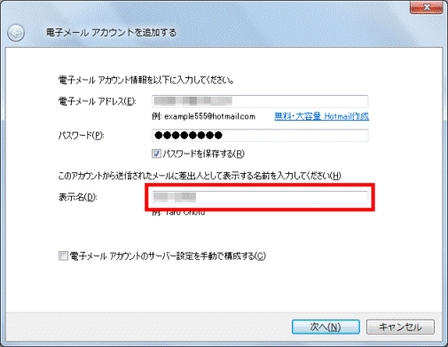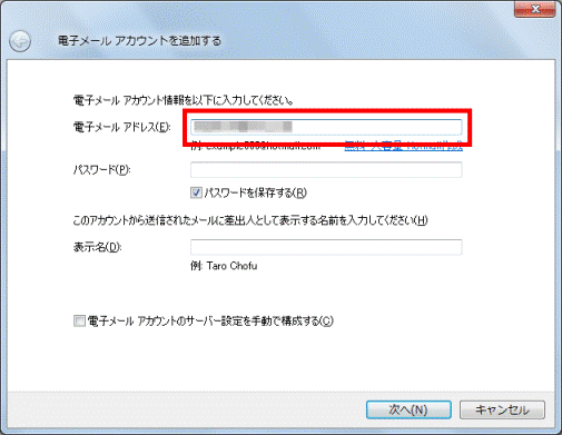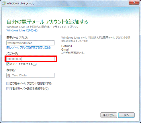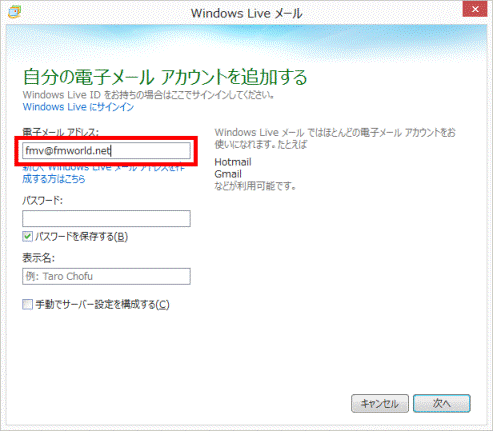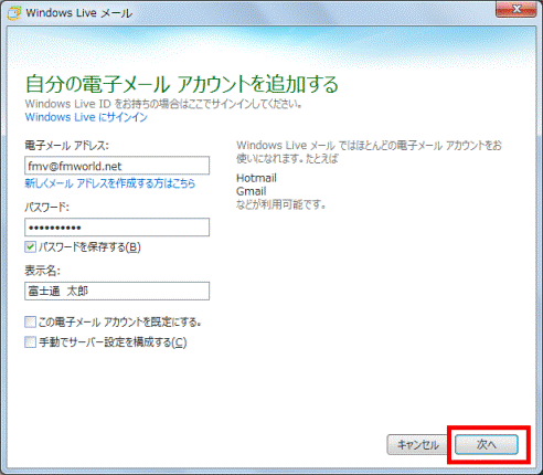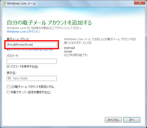 - Windows Live メールが起動して、「電子メールアカウント情報を以下に入力してください。」と表示されます。
