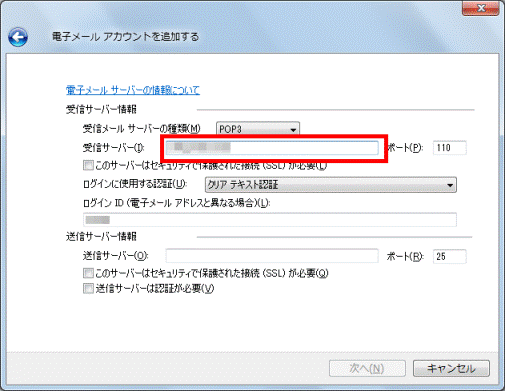 また、プロバイダーによっては、「ユーザーID」「メールID」などと呼ぶ場合があります。 - 受信メールサーバー名(POP3サーバー名)