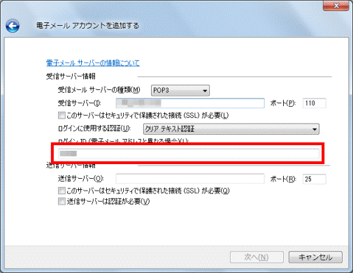 - ログインID(アカウント名)と電子メールアドレス(@の左側の文字列)が異なる場合は、「ログインID」欄に、ログインID(アカウント名)を入力します。