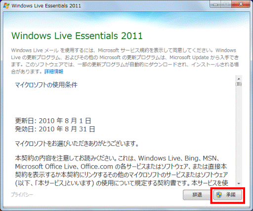 「マイクロソフトの使用条件」と表示されたときは、表示されている内容をよく読み、内容に同意する時は、「承諾」ボタンをクリックします。