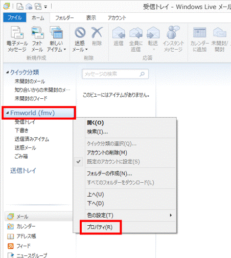 - アカウントを右クリックし、表示されるメニューから、「プロパティ」をクリックします。
