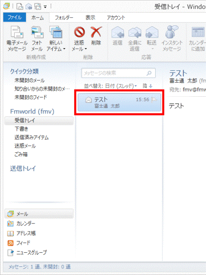 「迷惑メール」に移動したメールが、送信したテストメールであれば送受信は正しく行われています。