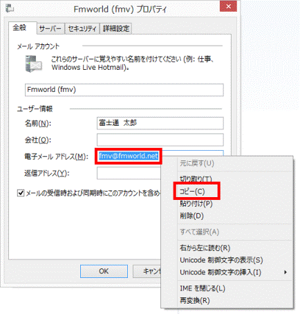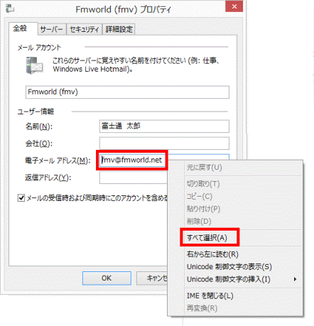 - 「電子メールアドレス」欄を右クリックし、表示されるメニューから、「すべて選択」をクリックします。
