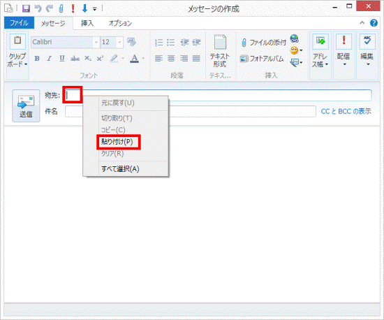 「宛先」欄を右クリックし、表示されるメニューから、「貼り付け」をクリックします。