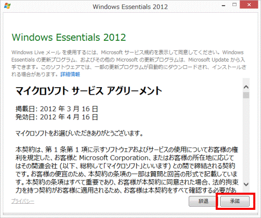 表示されている内容をよく読み、内容に同意する時は、「承諾」ボタンをクリックします。