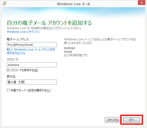 次の手順で、Windows Live メールに電子メールを送受信するための設定を行います。