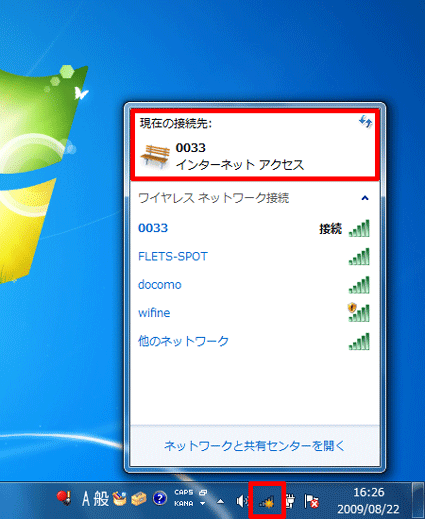 接続しているかどうかは、通知領域の「インターネットアクセス」をクリックして表示される「現在の接続先」でも確認できます。