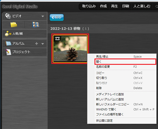 - 編集したい動画を右クリックし、表示されるメニューから「開く」または「簡易編集で開く」をクリックします。