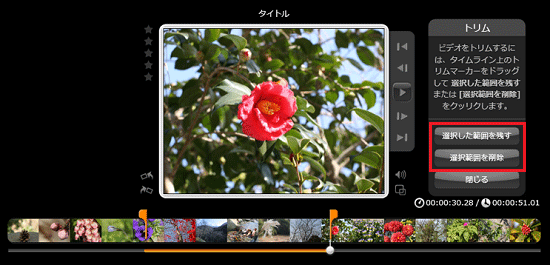 次の手順で、動画の必要な部分だけを残す、または不要な部分だけを削除します。