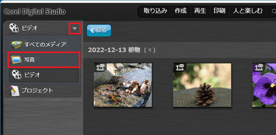 - 「ビデオ」欄の「▼」ボタンをクリックし、表示される一覧から「写真」をクリックします。