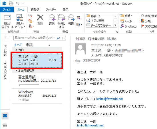 Outlook 2013に複数のアカウントが登録されている場合は、左側の一覧から、対象のアカウントをクリックします。
