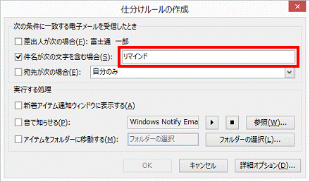 チェックがない場合は、「件名が次の文字を含む場合」をクリックしチェックを付けます。