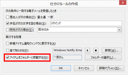 - 「アイテムをフォルダーに移動する」にチェックが付いていることを確認します。