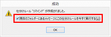 「現在のフォルダーにあるメッセージにこの仕分けルールを今すぐ実行する」をクリックしチェックを付けます。