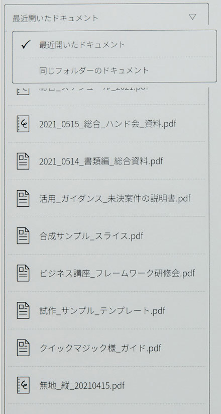 最近開いたドキュメント、または表示中ドキュメントと同フォルダーにあるドキュメント一覧を表示します