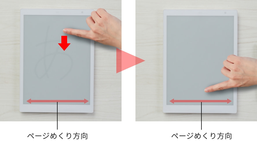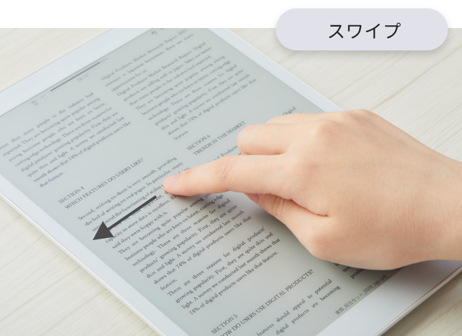 ドキュメント表示中に、うっすらと画面に残像が残った場合、スワイプすることで画面をリフレッシュして残像を消すことができます。ページめくりの方向に対して垂直にスワイプすると、画面が一瞬白黒反転した後に、残像が消えます。